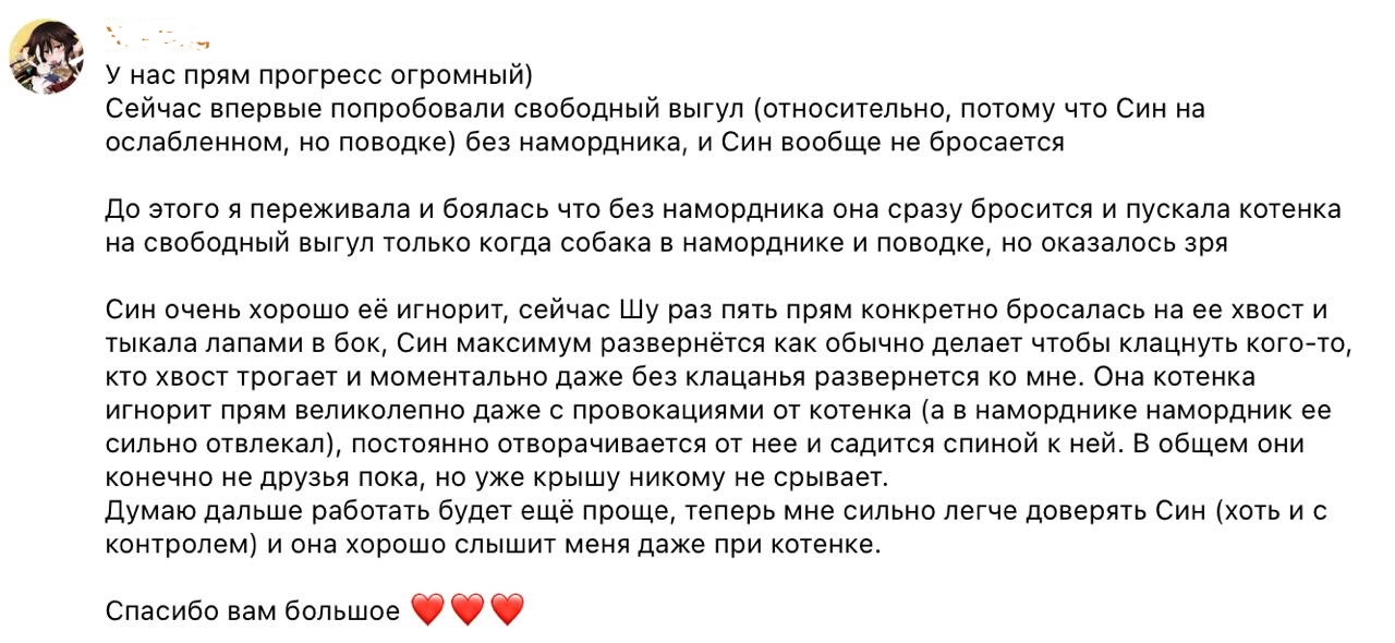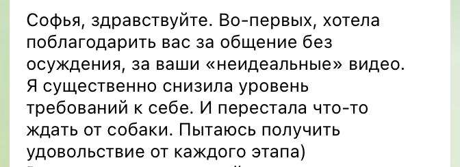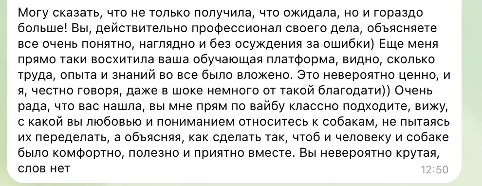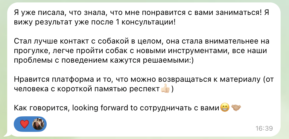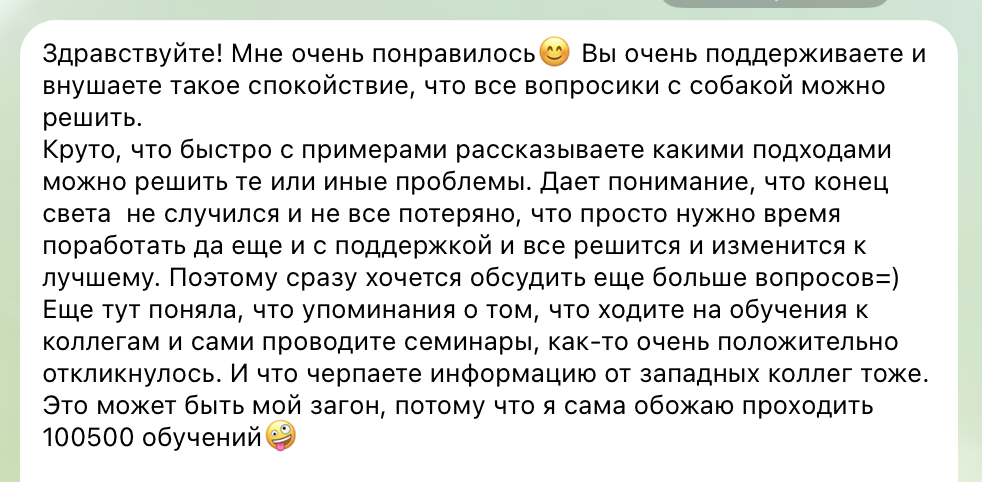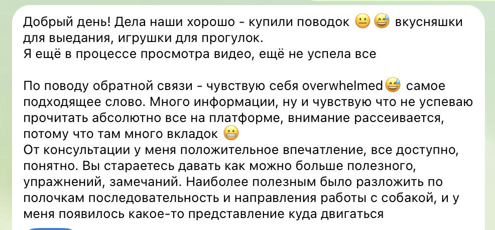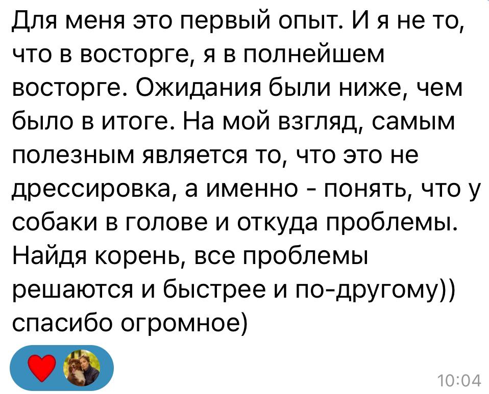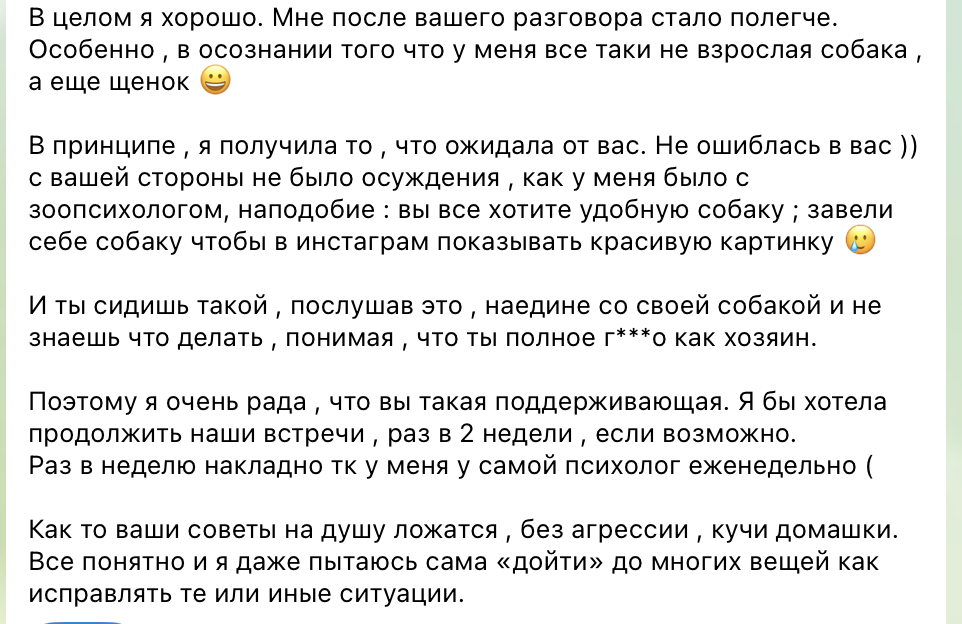 Поэтому онлайн-сопровождение это не только консультация, но и наше с вами общение после нее. Я остаюсь с вами в режиме "кинолога в кармане" в течение двух недель после консультации.