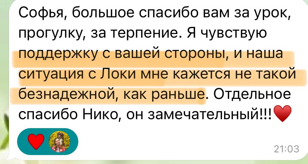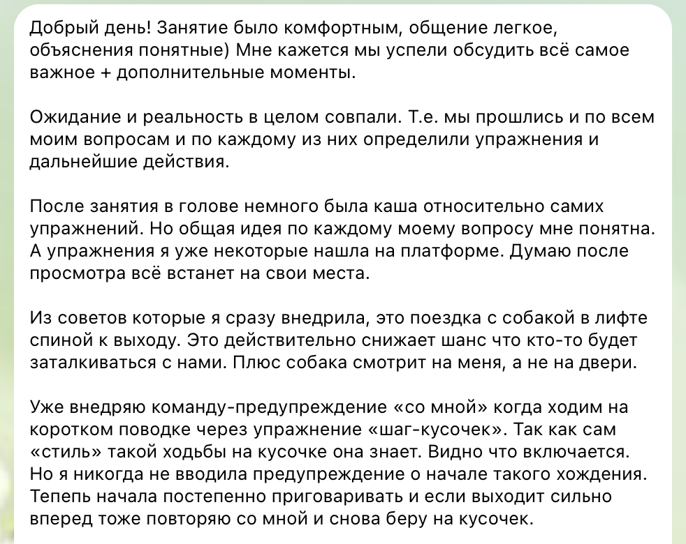 В течение 2 недель после последней онлайн встречи я остаюсь на связи в мессенджере: отвечаю на ваши вопросы, смотрю видео и помогаю на пути коррекции поведения и воспитания собаки. Такая опция называется “Кинолог в кармане”.